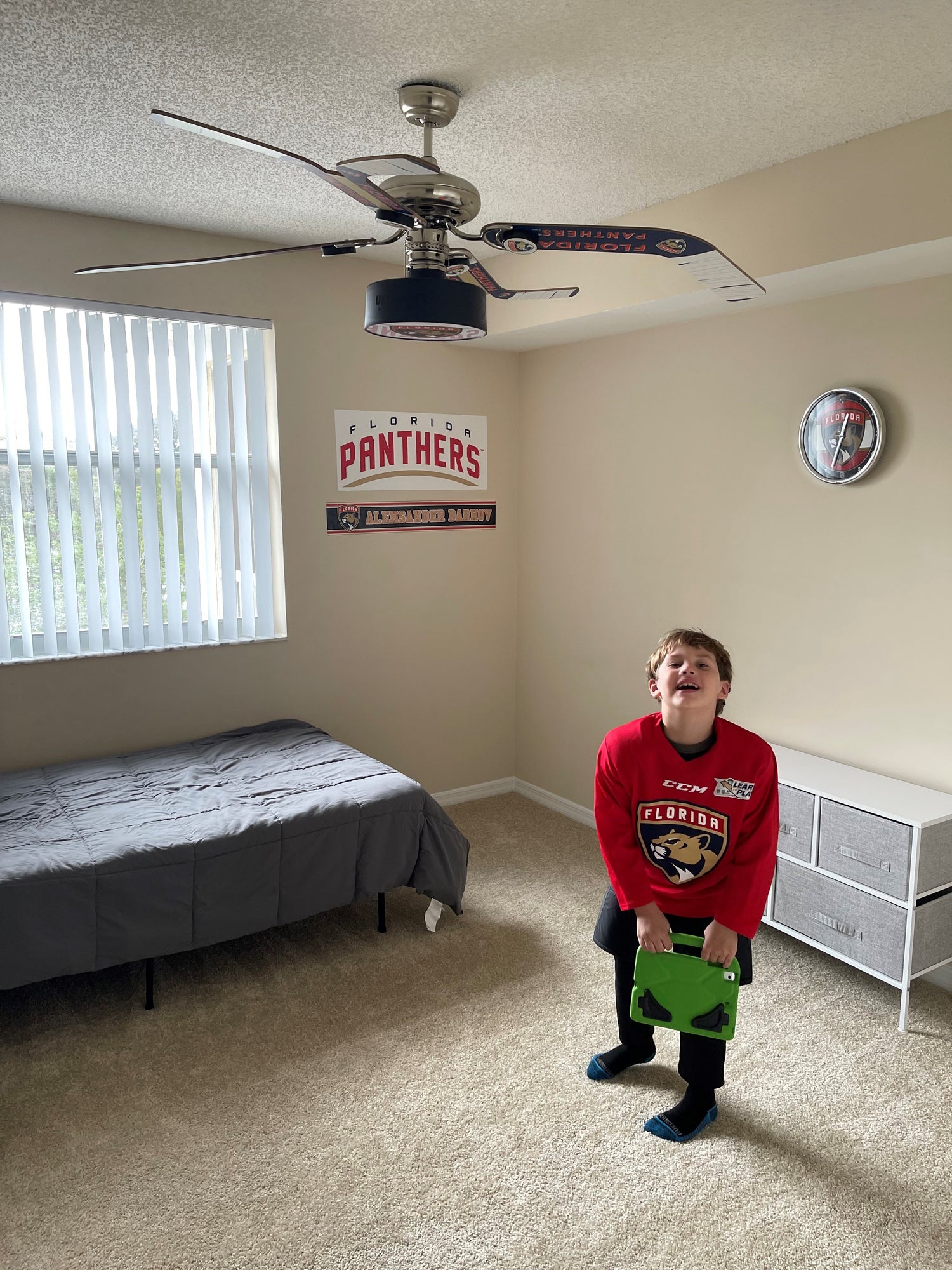 My son received this as a Christmas gift and just loves it. He’s a huge hockey fan and we had it installed in his bedroom. The fan is great and just as advertised. He was really excited about the customized the blades. There were so many options! It was delivered quickly and all the pieces were in the box. It was nicely wrapped so the fan blades were well protected. I emailed to find out what size bulb it took so I’d have everything ready for the electrician and I received a prompt answer back.