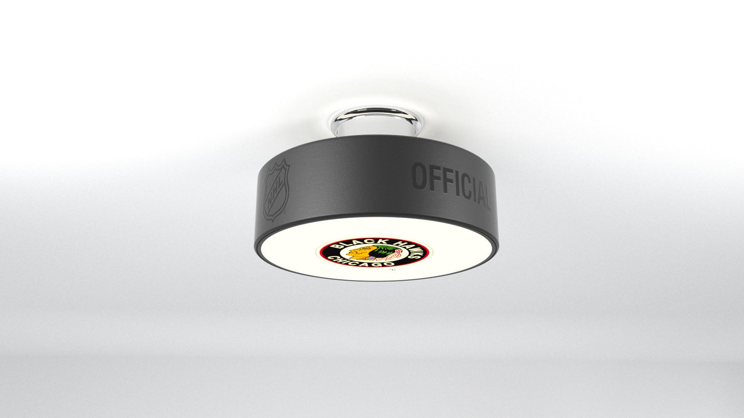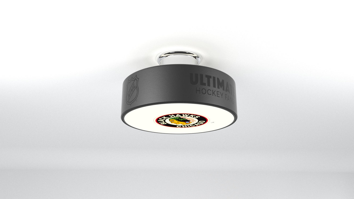 The Chicago Blackhawks® hockey puck light fixture is designed to illuminate any of your favorite Chicago Blackhawks® logos into any room.
