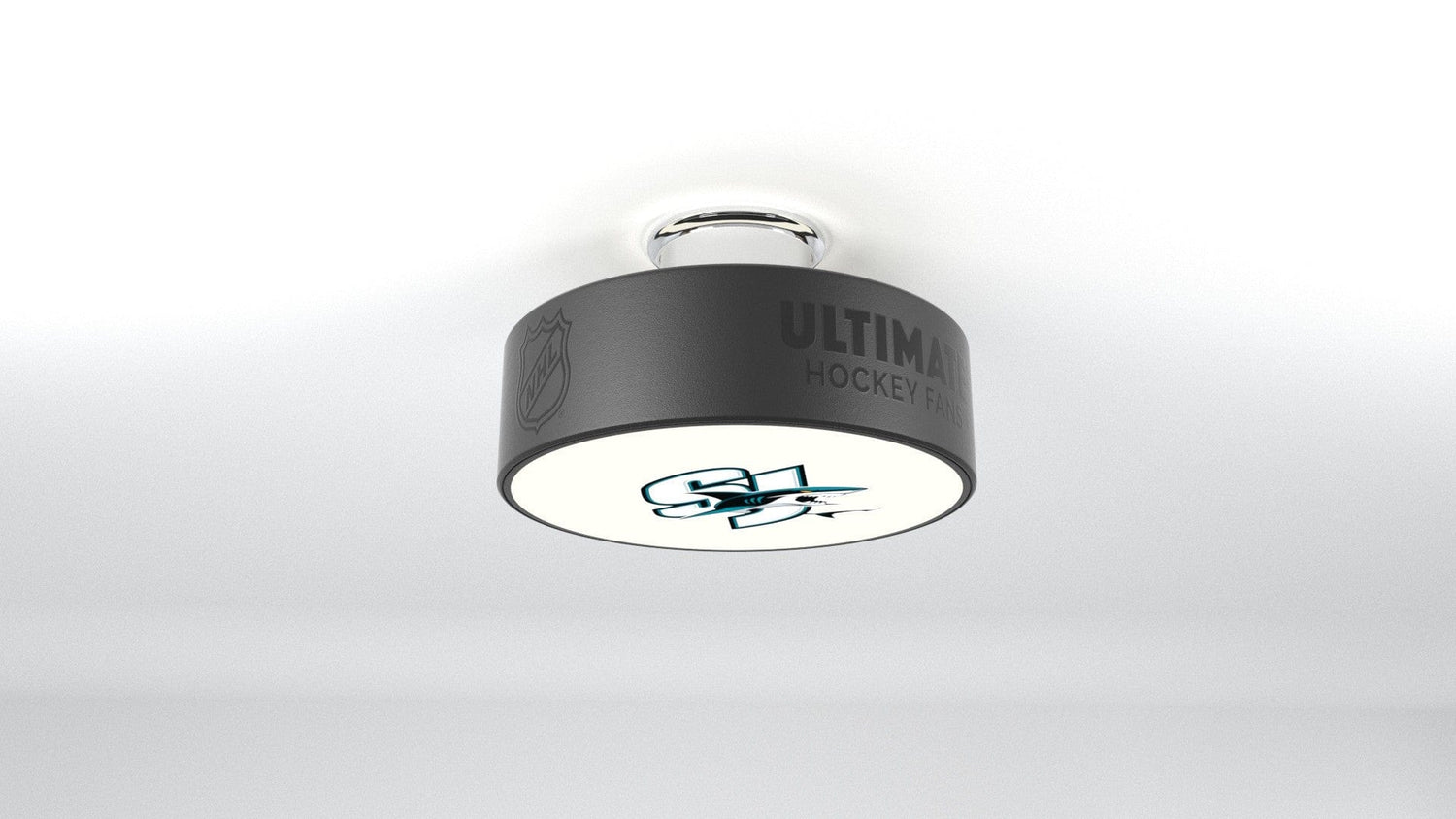 San Jose Sharks® officially licensed NHL hockey puck light fixture illuminates your choice of various San Jose Sharks® official logos.