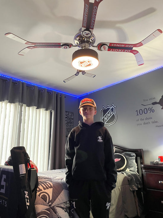 My son received this as a Christmas gift and just loves it. He’s a huge hockey fan and we had it installed in his bedroom. The fan is great and just as advertised. He was really excited about the customized the blades. There were so many options! It was delivered quickly and all the pieces were in the box. It was nicely wrapped so the fan blades were well protected. I emailed to find out what size bulb it took so I’d have everything ready for the electrician and I received a prompt answer back.